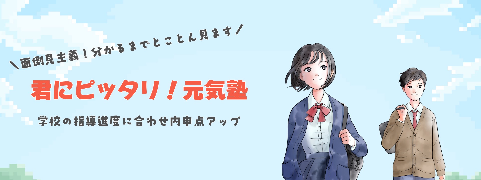 元気塾は岡崎市内で、小・中学生を対象とした地域密着型学習塾です。 『できるまでとことん指導』をモットーに、成績アップは間違いなし。